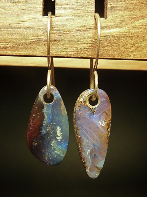 These hand-cut boulder opal earrings are small (about 5/8 of an inch tall) and light weight featuring hand-wrought sterling silver ear-hooks. Mined in Queensland, Australia.