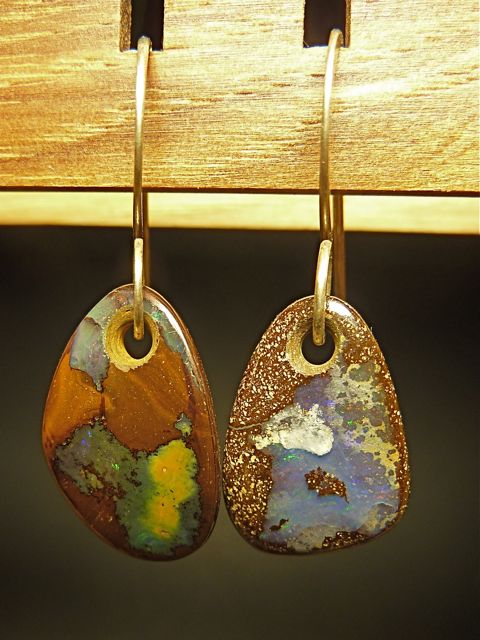 These hand-cut boulder opal earrings are small (about 1/2 of an inch tall) and light weight featuring hand-wrought sterling silver ear-hooks. Mined in Queensland, Australia.