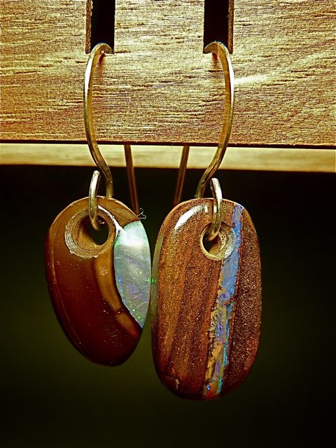 These hand-cut boulder opal earrings are small (about 5/8 of an inch tall) and light weight featuring hand-wrought sterling silver ear-hooks. Slightly thicker than Opal Earrings 1-3. Mined in Queensland, Australia.